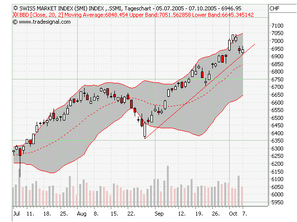 Und dann hat es auf dem Tageschart des EuroStoxx 50 auch noch eine Korrektur Anfang August, bei welcher sich das obere Band zwar nach unten gedreht hat, die Korrektur aber doch nur ungefähr bis zum MA ging. Der Chart ist ca. 5 Postings zurück. -