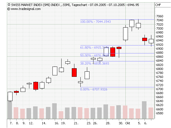 Und im SMI war Ende letzte Woche etwas zu sehen, das bei stärkeren Kerzen als Piercing Pattern gelten würde aber ich denke bei diesen kleinen Kerzen nicht. Dafür das Fibo Retracement von 61.8% an welchem es nun vielleicht wieder kehrt.