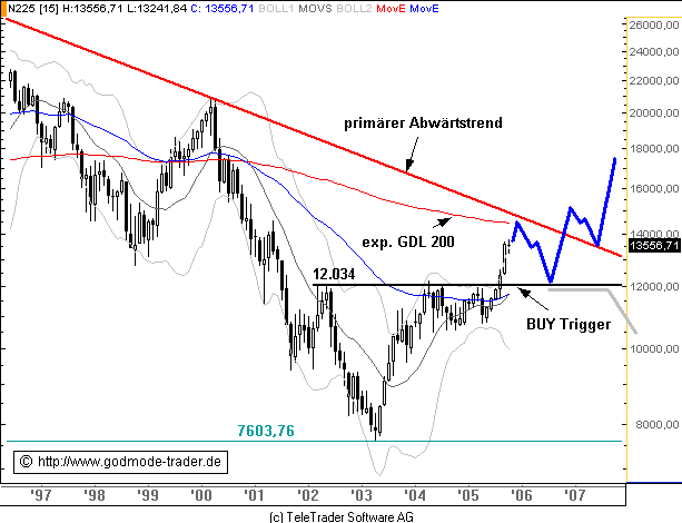 Diagnose/ Prognose: Der NIKKEI225 befindet sich in einem langfristigen Abwärtstrend. Die Baisse dauert bereits sehr lange an. In der Spitze gab es Abgaben vom Alltimehigh in Hähe von -80,5%. Innerhalb des langfristigen Abwärtstrends bildete der Nikkei225 seit 2003 eine mittelfristige Bärenmarkt Rallye aus. Die mittelfristige Bärenmarkt Rallye hatte im August ein wichtiges Primärziel bei 12.034,00 erreicht. Nur bei einem signifikanten Anstieg über 12.034,00 war eine Fortsetzung der Rallye möglich. Der Anstieg über 12.034,00 wurde in den letzten Wochen eindrucksvoll vollzogen. Der Nikkei225 stieg innerhalb von 2 Monaten 1.700 Punkte an auf 13.783. Weiteres kurzfristiges Aufwärtspotenzial ist abzuleiten. Als Hauptziel der nächsten Wochen dient der primäre Abwärtstrend bei etwa 14.700 im Zusammenhang mit der exp. GDL 200 im Monatschart bei aktuell 14.486. Ab 14.500/14.700 kann es zu einem Pullback bis zum aktivierten BUY Trigger in Höhe von 12.024 kommen. Im Anschluss ist dann der Anstieg über den primären langfristigen Abwärtstrend zu erwarten. Ein direkter Anstieg über den primären langfristigen Abwärtstrend bei 14.700 ohne vorherigen Pullback ist ebenfalls denkbar. Ein Rücksetzer auf Monatsschlussbasis unter 12.024 sollte nun durchgängig vermieden werden, um die bullischen Ziele nicht zu gefährden.
