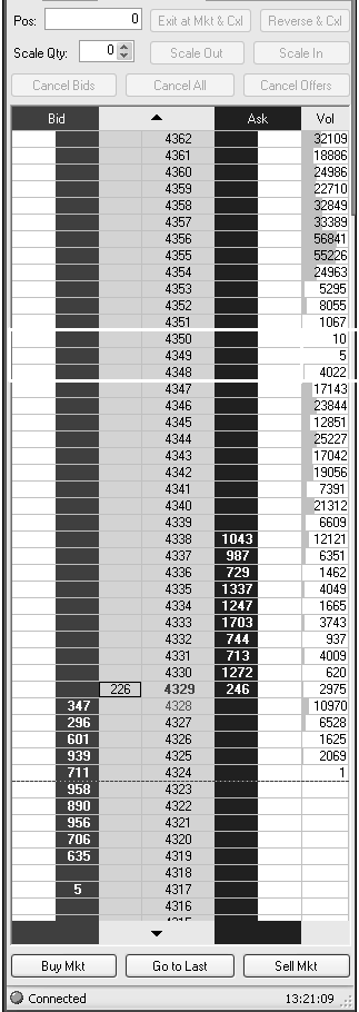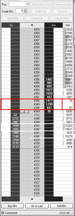Die rote Markierung auf Bild 1 zeigt die Kurslücke. Im Bereich 4550-4548 wurden so gut wie keine Kontrakte gehandelt. Die 4349 blieb völlig leer. Slippage lässt Grüßen.