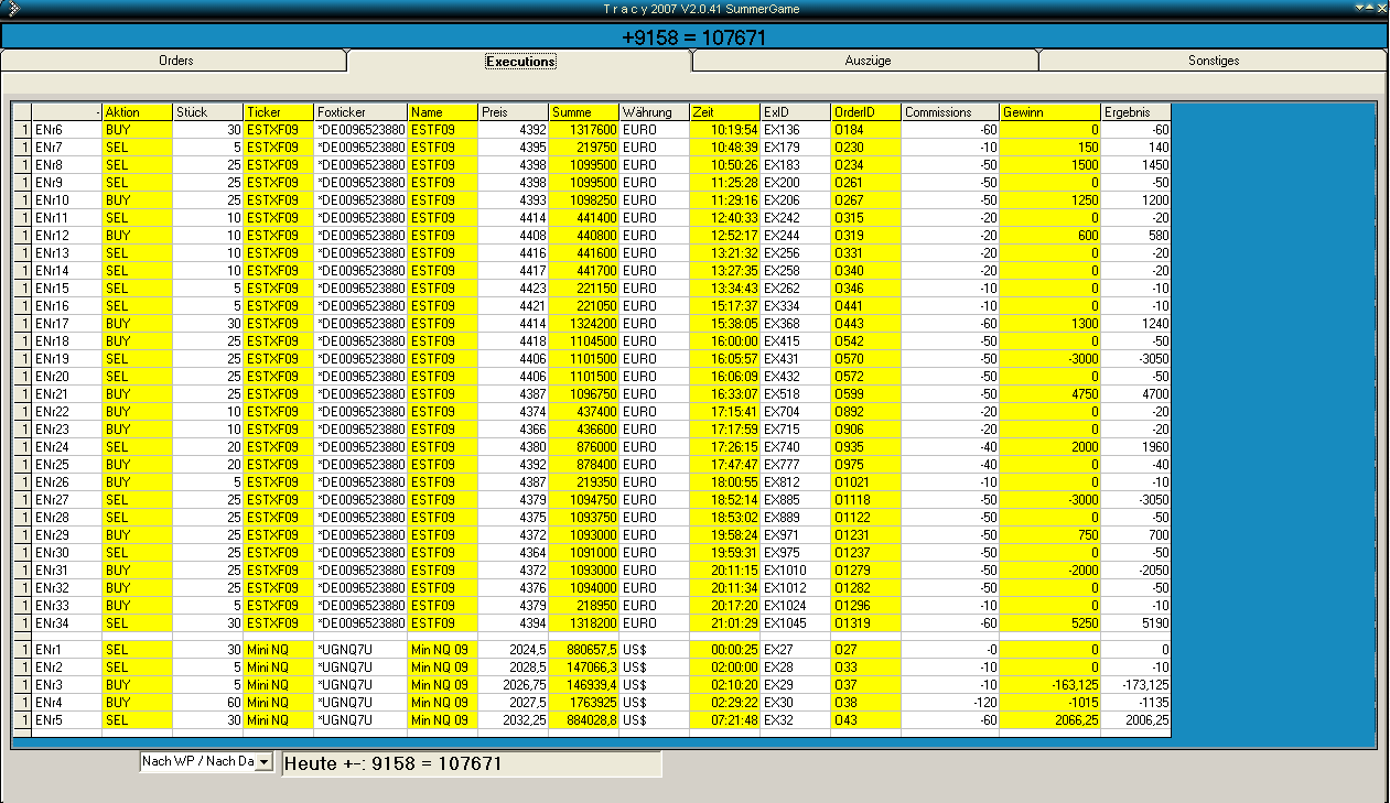 Zudem habe ich auf Tracy bisher immer nur "gezockt", NACHDEM ich den realen Handel schon beendet hatte. Aufgrund des hohen Tagesverlustes gestern, mußte ich meinen Handelsstil heute im Game auf einen mehr oder weniger trendfolgenden Ansatz umstellen, da ich überwiegend simultan gehandelt habe. Der reale Handel sollte dadurch aber keinesfalls leiden! Wer würde denn sonst meine Brötchen bezahlen!?