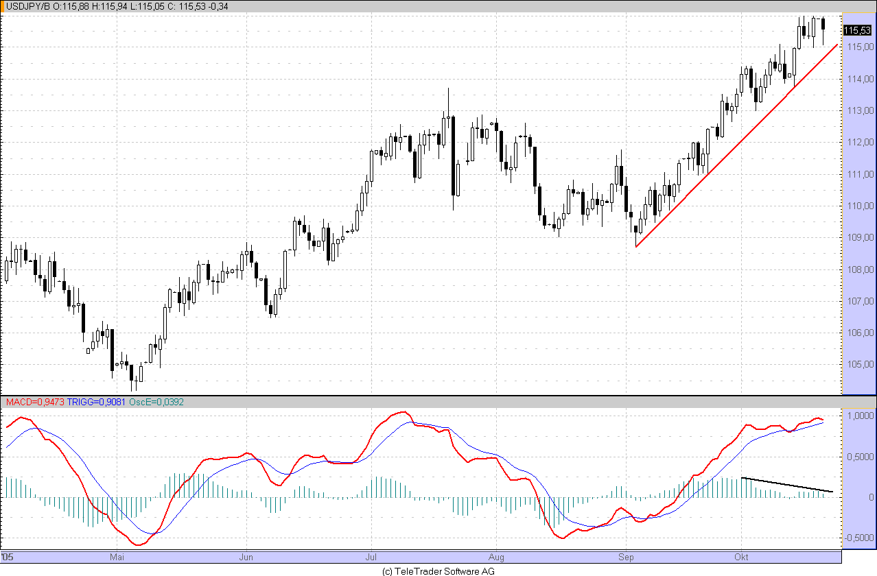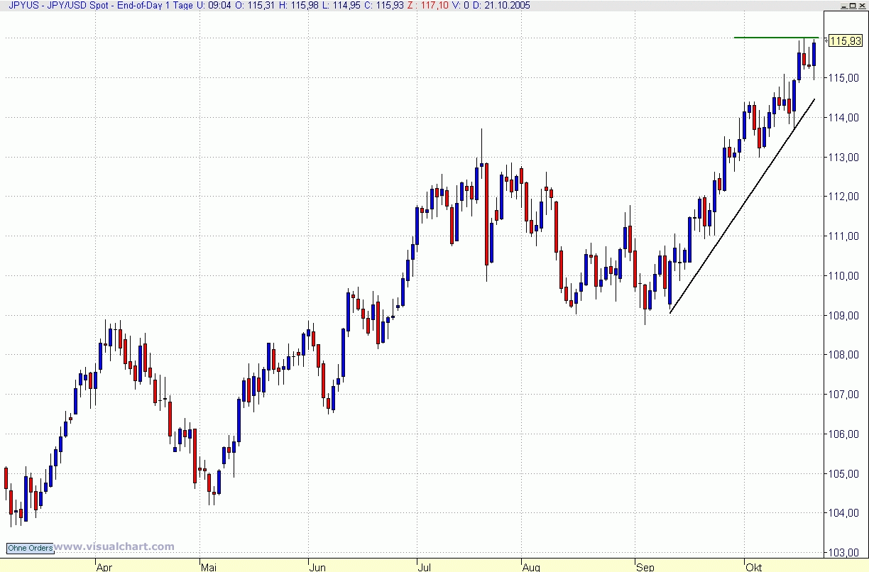 18. Oktober 2005 Verkehrte Welt am Devisenmarkt. Denn der Yen befindet sich gegen den Dollar in der Defensive und hat am Dienstag mit 115,71 Yen je Dollar den schwächsten Stand seit etwas mehr als zwei Jahren erreicht. Der kurzfristige Trend zeigt weiterhin nach oben. Die Markttechniker könnten sich unter anderem durch die Tatsache beflügeln lassen, daß die Währung die Widerstandsmarke von 114,88 Yen - dabei handelt es sich um das jüngste Zwischenhoch vom Mai des vergangenen Jahres - überwunden hat.