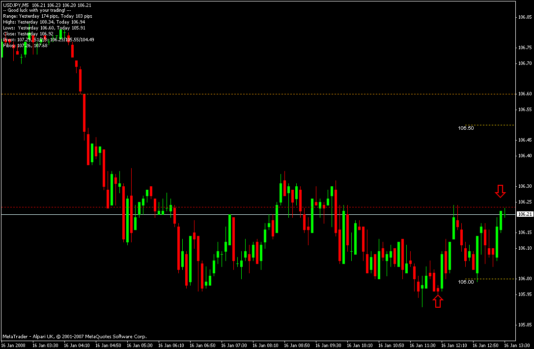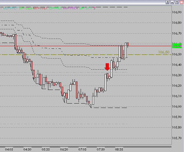 Nach Abwärtsmove ist ein Doppelboden am SP 106,00 zu erkennen. Entry Long @ 105,98, SL 105,91, TP 106,23 (=S1).