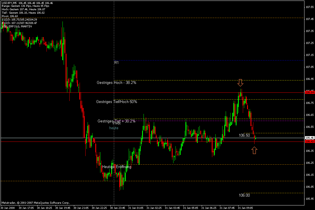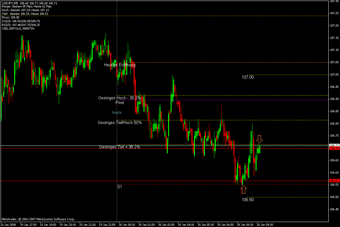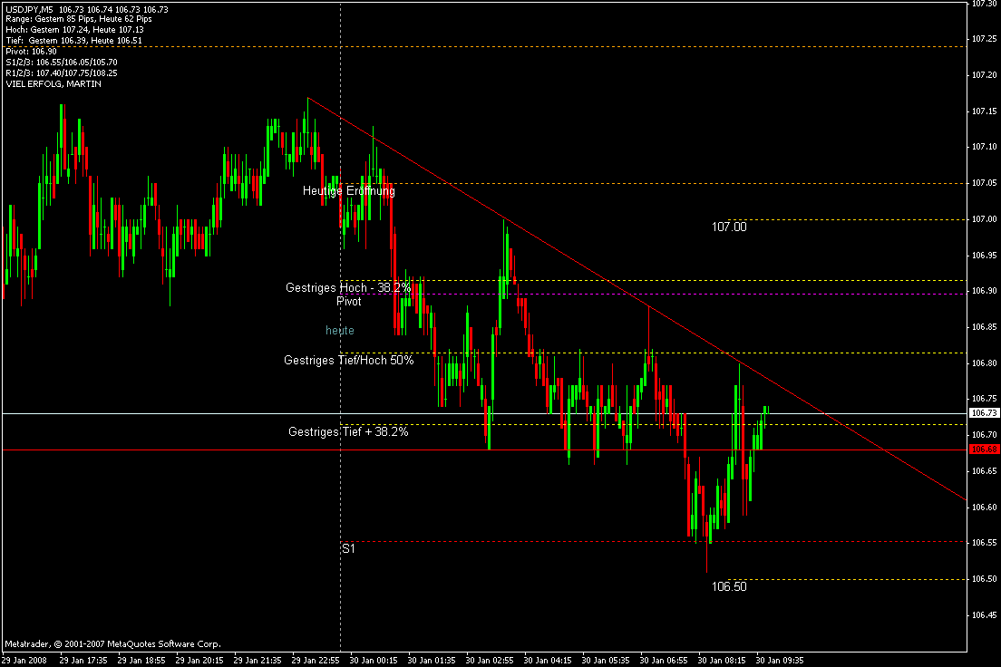Zum Trade: Der Yen ist aus meiner Sicht im Abwärtstrend und macht neue Tiefs bis 9.30 Uhr. Dann kommt Korrektur und ich suche Level für Einstieg Short. Bei 1,7080 liegt die Mittellinie der Tagesbewegung also 50% Retracement, wenn man so will. Nun lange Dochte und Doppeltop an der Linie. Ist für mich ein Versuch Wert. Der Rest ist Geschichte.