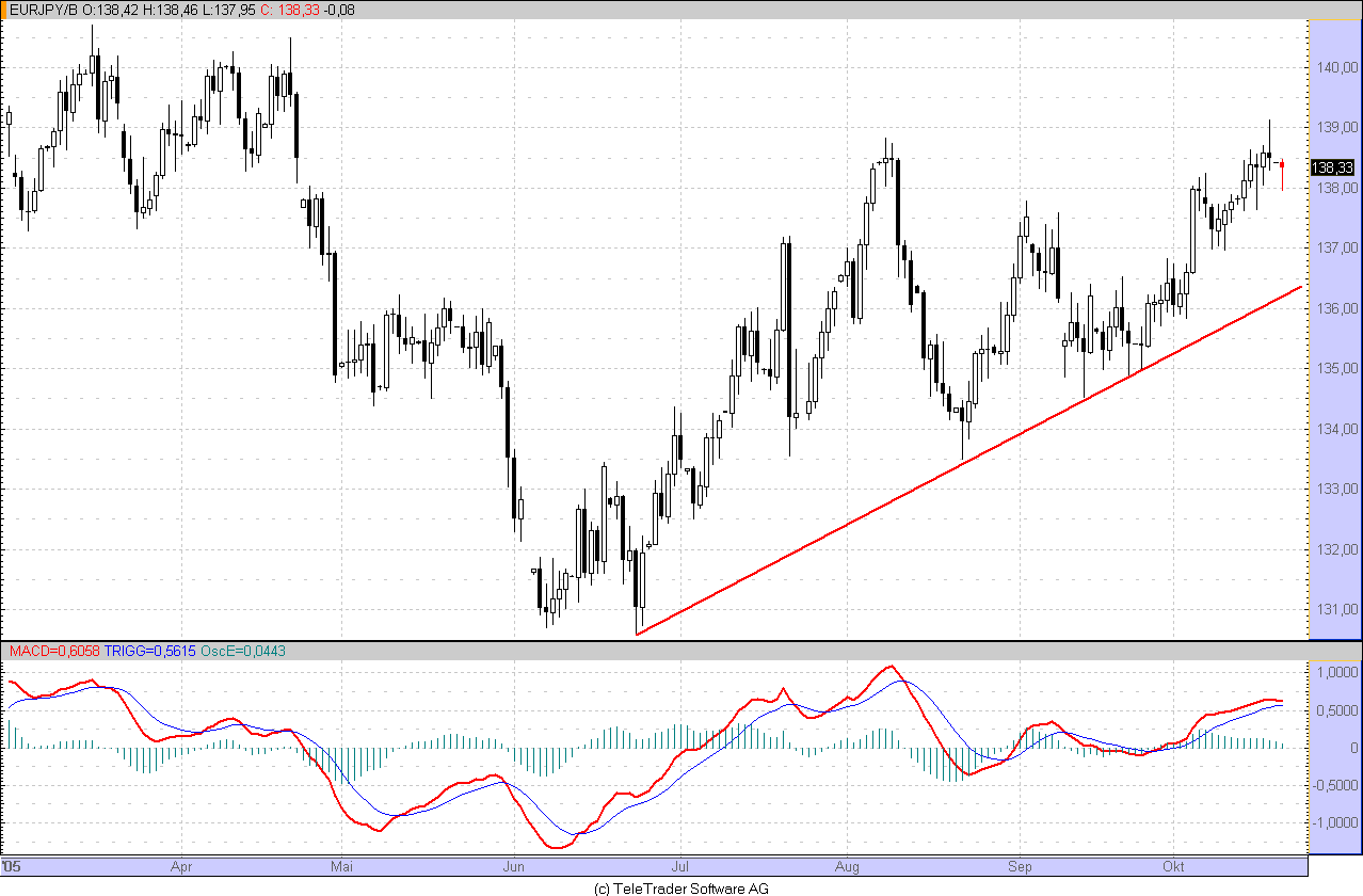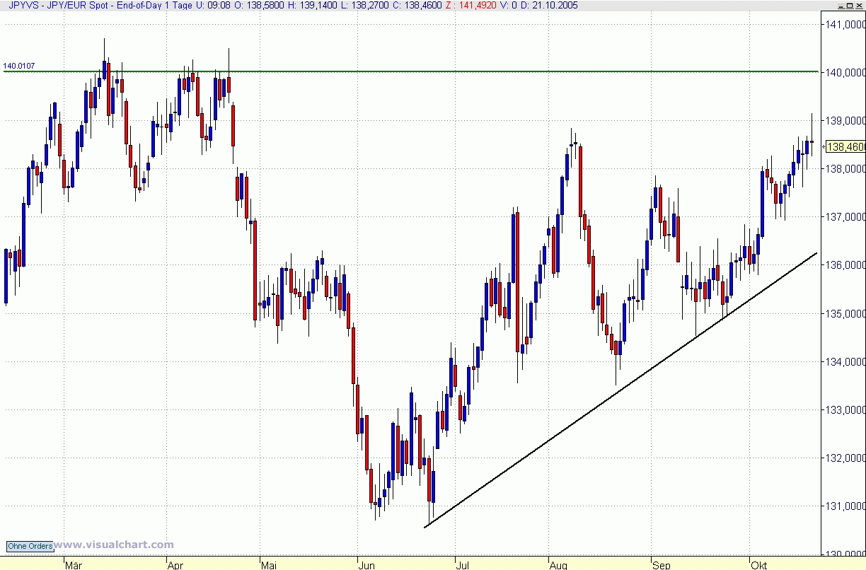 18. Oktober 2005 Verkehrte Welt am Devisenmarkt. Denn der Yen befindet sich gegen den Dollar in der Defensive und hat am Dienstag mit 115,71 Yen je Dollar den schwächsten Stand seit etwas mehr als zwei Jahren erreicht. Der kurzfristige Trend zeigt weiterhin nach oben. Die Markttechniker könnten sich unter anderem durch die Tatsache beflügeln lassen, daß die Währung die Widerstandsmarke von 114,88 Yen - dabei handelt es sich um das jüngste Zwischenhoch vom Mai des vergangenen Jahres - überwunden hat.