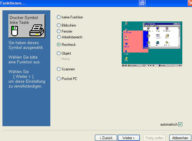 Bild 1 erscheint. Ich habe bei mir folgendes eingestellt: "Druckersymbol linke Maustaste" --> "Weiter"