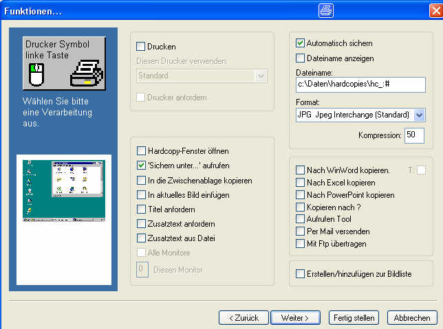 Man kann das so konfigurieren, dass es autom. bei Druck auf den Button in der Window-Leiste ein Fadenkreuz zur Auswahl des zu kopierenden Bereichs liefert. Dieses wird dann autom. z.B. als komprimiertes JPEG mit einem vorzudef. Kompr.Faktor in ein vorkonfig. Verzeichnis gespeichert.