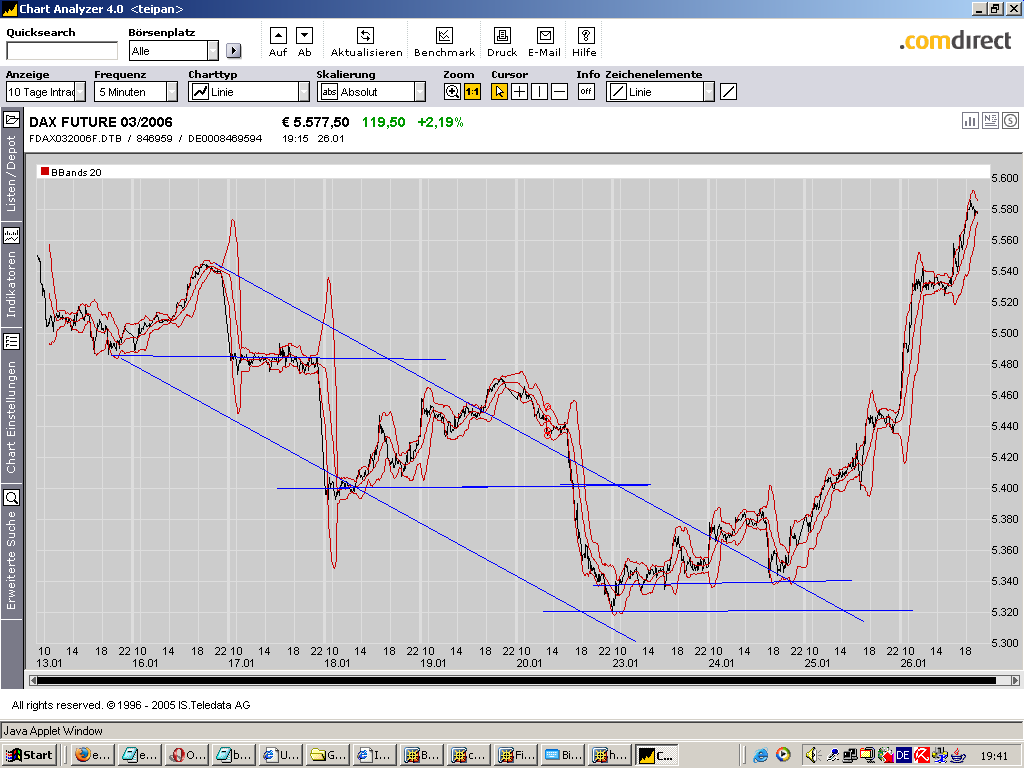 zum einen (soweit man das sehen kann) weist schon das nur schwache Gefälle des MA auf nur schwachen, gar nicht erst ausgeprägten Abwärtsdruck hin; dem entspricht auch der an dieser Stelle im Nachhinein ja erkennbare vorherige Kursverlauf, den ich so interpretieren würde: der Abwärtsversuch vorher mit dem Überschießen über die BBD hinaus schaffte es nur, die BBD kurz einmal minimal aufzuweiten, und gleich gings in eine leicht abwärts geneigte synchrone Phase über, die von einer Aufwärtskorrektur bis an den MA geprägt wurde.
