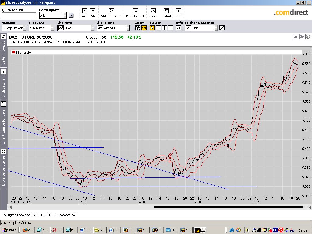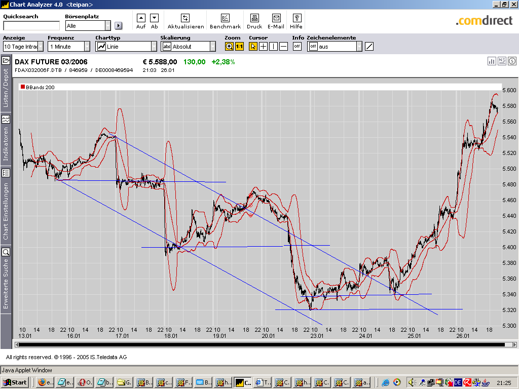 Auch den short habe ich nicht getraded, da er für mich aus heiterem Himmel kam und keines meiner setups erfüllt waren. MA noch aufwärts, BBD in der Kompression. Für ein antizyklischen short, wie ich in hier auch schon vorgestellt hatte, war der Kurs und somit der IS zu weit vom BBD+ weg. Diese Bewegung bereitet mir ein wenig Kopfzerbrechen, da es dynamisch über 40 Ticks runterging und wirklich keines meiner setups paßt.