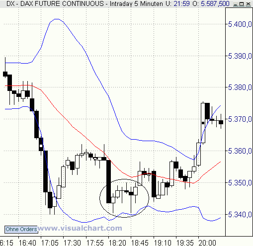 Mein Signal war eigentlich ziemlich eindeutig, das setup hatte ich schon hier vorgestellt, allerdings im FGBL. Zuerst neutrale BBD, dann Expansion break out mit Tiefpunkt außerhalb, anschließend Synchronisation mit reentry short, dann der dritte und vierte Test des Tiefs bei eingedrehten BBD. Günstigerweise sehr nahe am BBD- wodurch der IS mit 9 Pkt bei 5337 sehr eng war. FDAX hatte gut 20 Pkt Platz, CRV also >2:1. Danach Kontraktion mit anschließender Expansion break out, also auch wieder ein Signal.