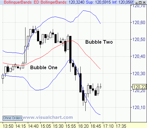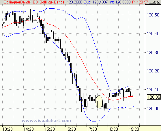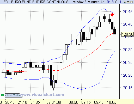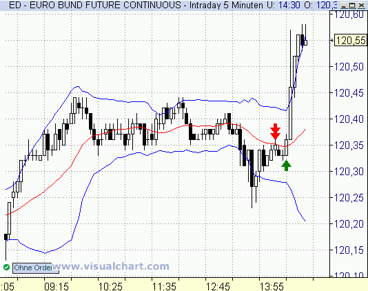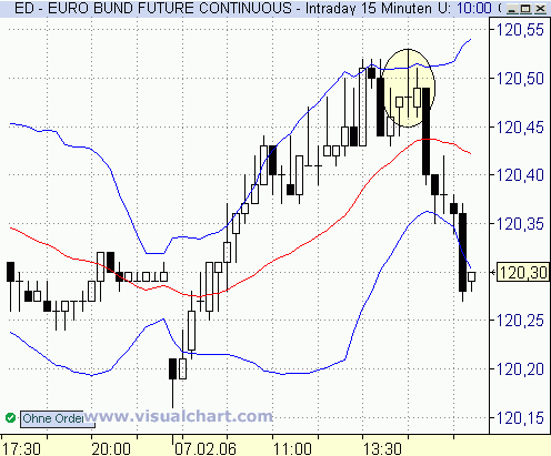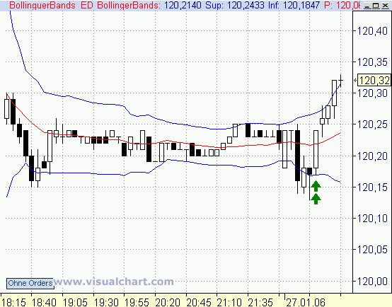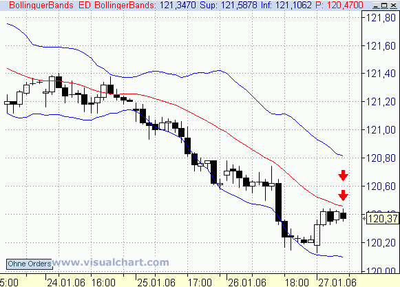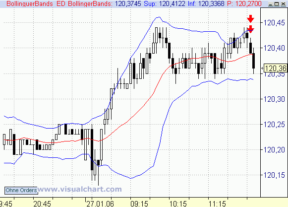 Im 60min bahnte sich ein headfake an (beachte das gegensätzliche Verhalten der äußeren BBD). Nach dem gravestone doji im 15 min an den 120,50 und dem seitwärts laufenden, als Widerstand wirkendem BBD+ bin ich per limit short, das in der nächsten Kerze ausgelöst wurde. Der IS durch das nahe BBD+ bei 120,54 sehr eng. Das BBD- und der BBDMA zwar noch aufwärts, allerdings mit fehlender bzw. nachlassender Dynamik (viele lange obere Schatten, Ausbruch über 120,50 wird sofort korrigiert). Insgesamt also mehr ein Indizientrade denn eines meiner setups. Allerdings war klar, daß ein Ausbruch über das BBD+ die Tradeidee short zerstört hätte und daher ein Einstieg gerechtfertigt. Und ganz nebenbei, der Kurs war fast eine ATR ohne Korrektur gestiegen.