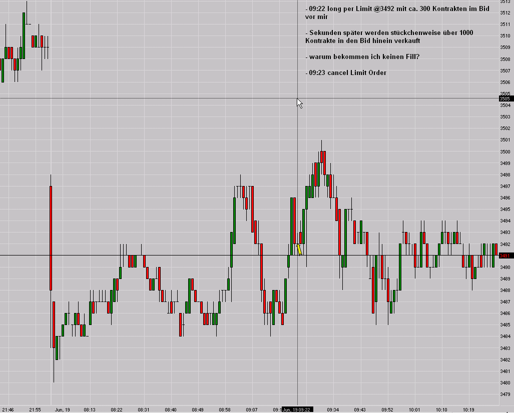 Wie im Chartbild ersichtlich, wollte ich long im Fesx, als sich ein Rücksetzer anbot. Ich war natürlich nicht der 1. im Buch. Vor mir standen ungefähr schon 300 Kontrakte drin. Danach gingen auf der 3492 häppchenweise mehr als 1000 Kontrakte über die Theke. Nur mein Fill kam nicht zustande ?( Als das ersichtlich wurde, hab ich die Order gecancelt.
