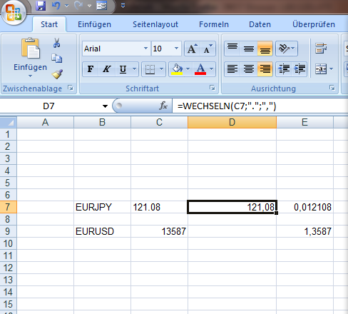 obige Formel in eine dir beliebige freie Zelle einfügen, dann sollte der Punkt von EURYEN in ein dt.Komma umgewandelt werden.