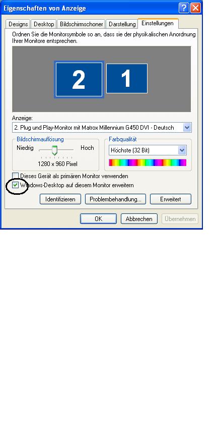 Wenn das eine Matrox G 450 MMS ist, dann hast du Software dazu - oder du kannst sie dir von der Matrox Page downloaden - mit der du einstellen kannst, wie die Grafikkarte arbeiten soll.