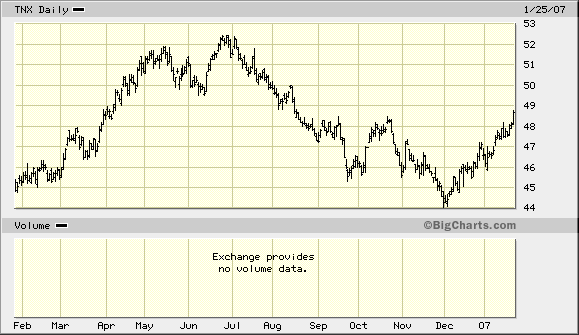 Rasant steigende Rendite für 10 jährige US Anleihen (49 = 4.90%):