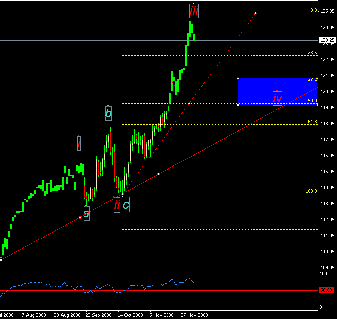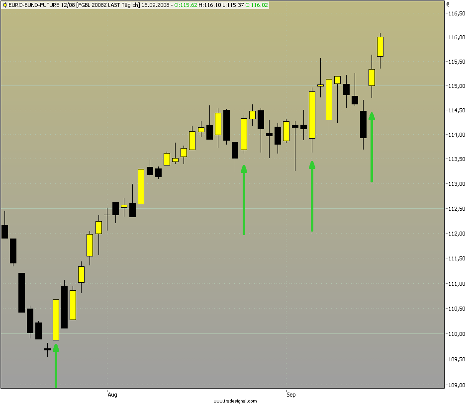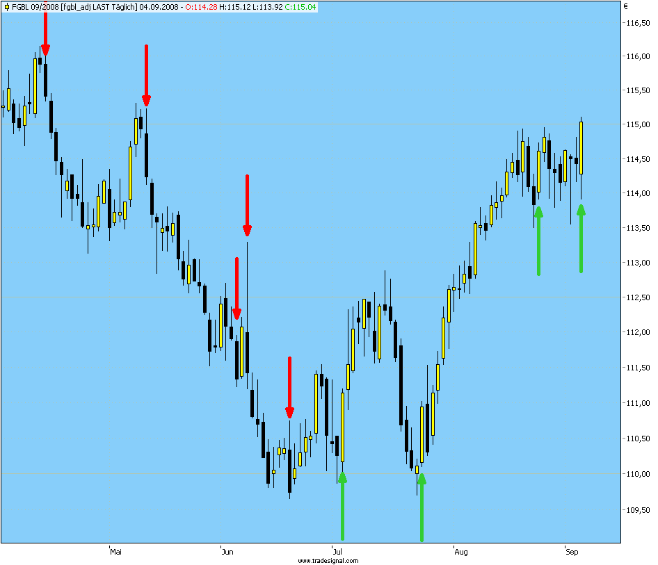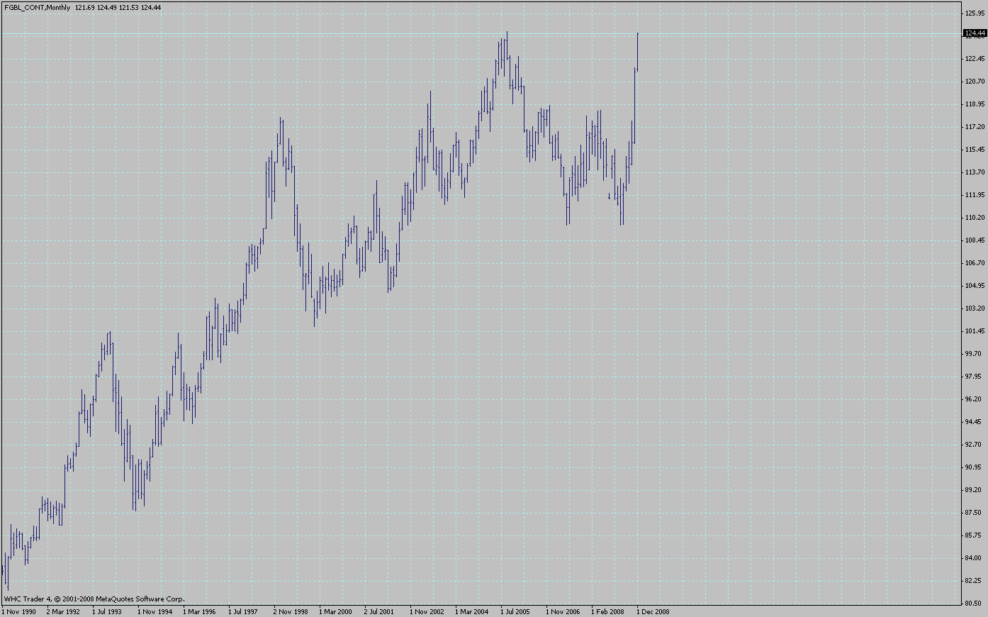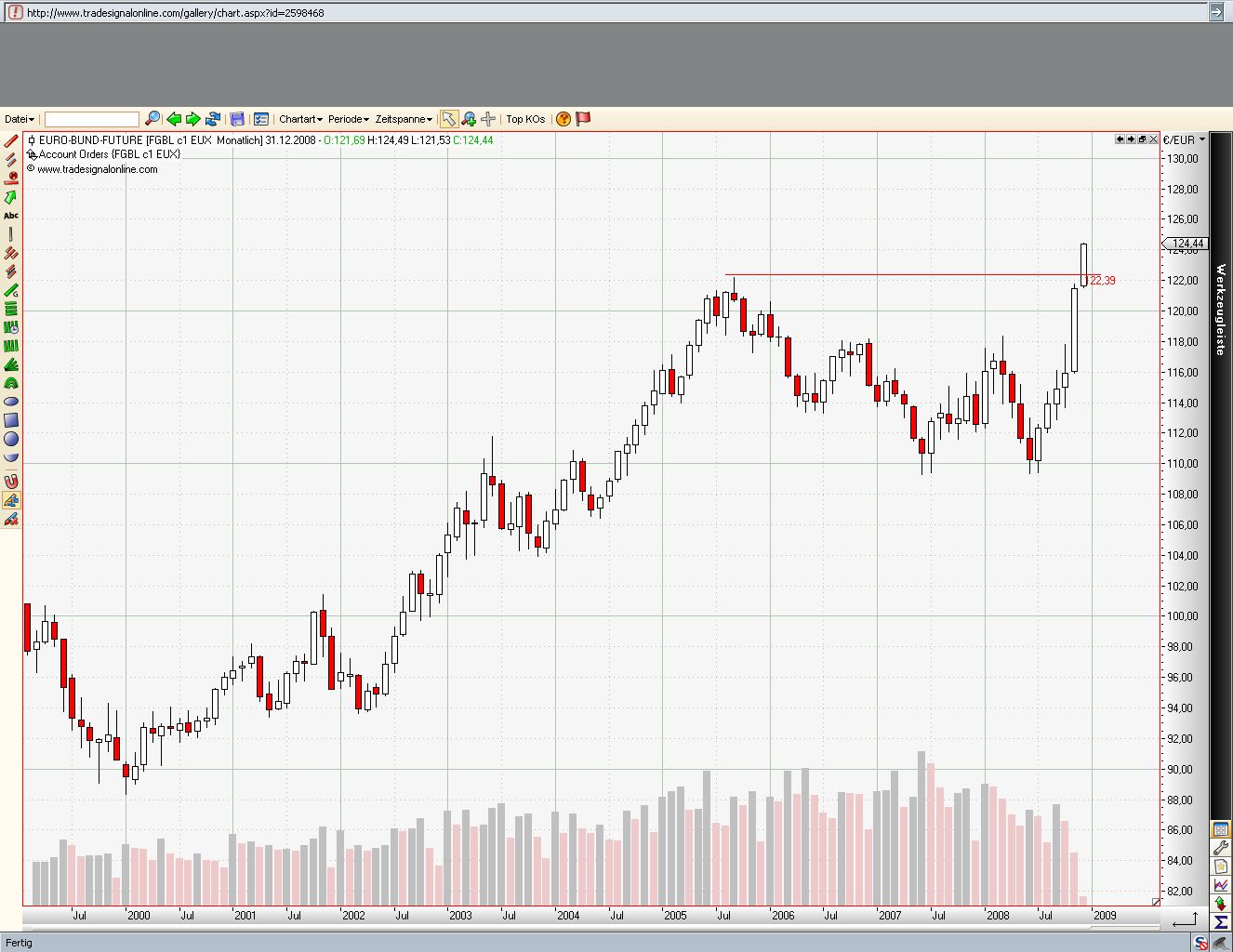 Beim Screenen der Charts ist mir der Bund-Future aufgefallen. Dieser kommt an ein interessantes Niveau an. Das Hoch aus dem Jahr 2005 wird in diesen Tagen erreicht. Wenn man sich den Chart genauer ansieht, bemerkt man, dass der Bund seit dem Zwischentief bei 110 in einem Zug nach oben gelaufen ist. Dies könnte durchaus ein interessanter Trade auf ein Doppeltop werden. Ein Eindrehen des Kurses auf diesem Niveau würde dieses bestätigen. Dann würde gelten: