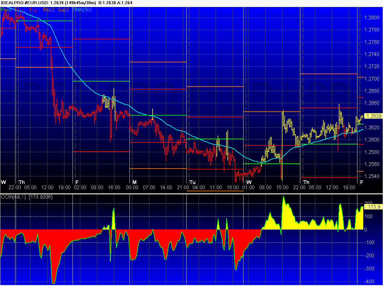 Im Anhang mal ein Beispiel mit Pivots, EMA50 und CCI. Die Bars sind eingefärbt rot für CCI unter null, gelb für CCI über null. Ich mag diese "Coloured Bars" sehr ....