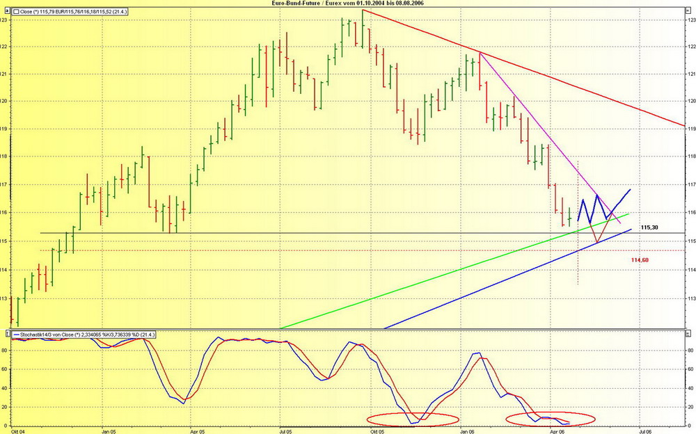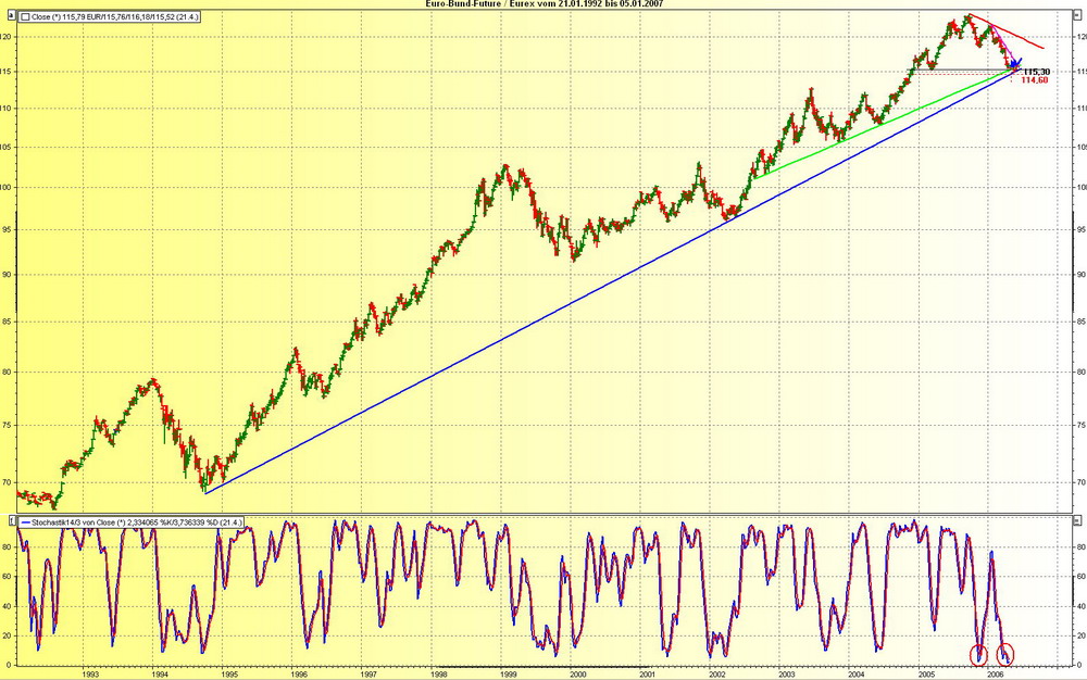 Solange die blaue Aufwärtstrendlinie nicht mit einem Tagesschlußkurs gebrochen wird (für nächste Woche bei ca 114,6) handele ich folgendermaßen: