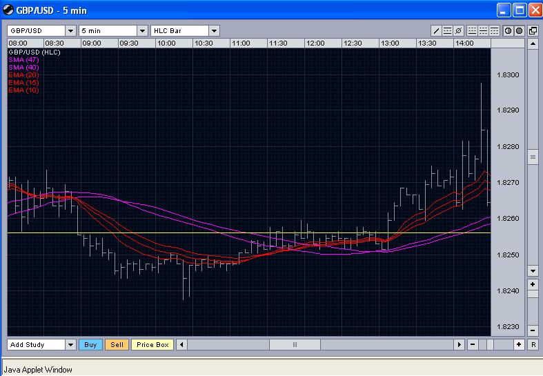 short bei 56, cover bei 56 (Bestätigung der Trendwende durch 5 MAs gegen 12 Uhr) long bei 90, TP bei 18340. Ein interessantes Beispiel ist die kurzfristige Bewegung gegen 14.30 Uhr: normalerweise hätte man sich ausstoppen lassen, um dann bei 90 wieder einzusteigen. Doch gab es nur eine candle, die die 2 SMAs durchstossen hatte, und die Folgekerze war wieder bullish. Daher wäre es vernünftig gewesen, einfach im long drinzubleiben. In diesem Falle hätte man aber wirklich risikofreudig sein müssen: der potentielle DD wäre hier -48 pips gewesen (18290-18242)