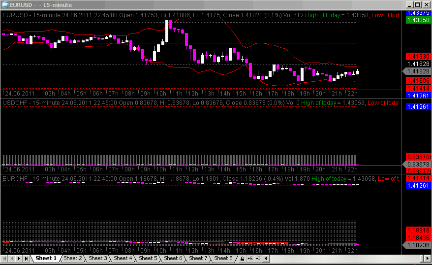 Unten siehst du mal ein Bsp mit Indikatoren in Extrafenstern. EURUSD ist als Hauptunderlying eingestellt. Für die Fenster 1 und 2 waren keine Änderungen nötig, normaler Price AFL und Standard ADX AFL. In Fenster 3 und 4 befindet sich das Bsp. Foreign-Paar. Orange markiert sind die Änderungen die im Vergleich zum vorherigen AFL vorgenommen wurden. Im 3. Fenster wurde für den Grid AFL aus diesem Thread Close durch Foreign ("C" in dieser Funktion steht für Close, nur dieses Mal für den des fremden Tickers) ersetzt, sowie der Preis AFl aus Posting 191 verwendet. Für die Foreign ADX Darstellung mußte der Standard ADX AFL aus Fenster 2, wie zu sehen, so umgeändert werden, dass er auf den Foreign Ticker wie demjenigen aus Fenster 3 angewendet werden kann oder einen beliebig anderen.