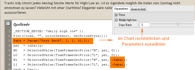 Da in deinem Beispielfall Samstag- und Sonntagdaten vorhanden sind, müsstest du montags auf 3 stellen. Die Funktion Param in einem Code sagt immer aus, dass es etwas einzugeben/einzustellen gibt. -