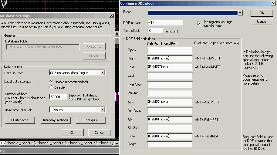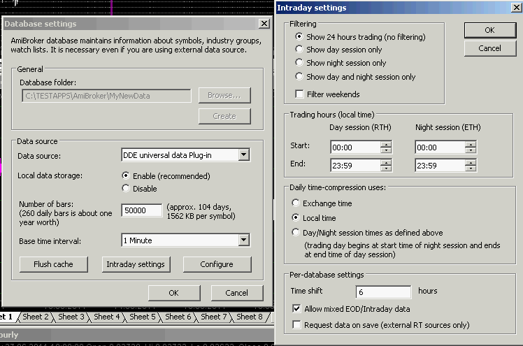 Nee, glaube nicht, dass es an der Zeitzone liegt, dann würde ich das ja auch beobachten. Ich vermute eher einen Fehler im Format File. Oder beim Export vom MT4 Skript. Lade mal bitte die AB Skripte, die Format Dateien, die angesprochen werden, die Bsp csv Datei von AUDUSD, die von MT4 exportiert wird und das MT4 Skript hoch. Mache mal bitte noch Screenshots von den Data base settings sowie vom DDE Plugin und packe diese mit in den zip file rein.