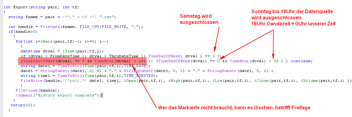 Noch etwas zu MT4. Damit auch die ausgewählte Historie mit dem ausgewählten Zeitbreich exportiert wird, muss diese Historie auch vorhanden sein. Es müssen also anhand geöffneter Charts plus scrollen diese Historien geladen werden (im MT4). Oder über Downloadbutton im History Center des MT, aber dann wird, glaube ich, von Metaquotes heruntergeladen. -