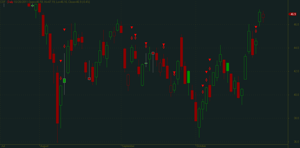 dann wenn fertig gescannt ist, eine Zeile doppelklicken und es müssen zusätzliche grüne Pfeile im Chart erscheinen, die die selben Bars markieren, die mit der durch die Plotfunktion erzeugten grünen Dreiecke markiert werden.