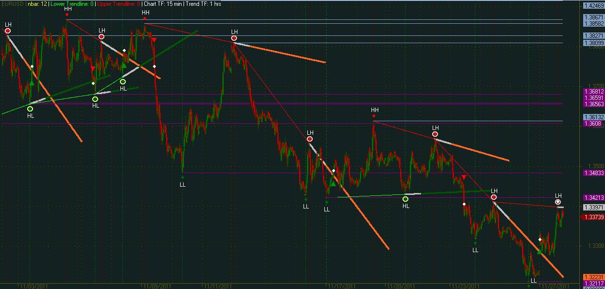 Es gibt aber AFLs, die sowas automatisch einzeichnen. Siehe z.B. unten ein Auto-Trendlinen AFL und ein Auto-Sup&Res AFL. Diese Linien sind alle nicht per Hand eingezeichnet. Von wo bis wo die Trendlinien gezeichnet werden sollen, wird in den Parameters über die nbar Einstellung geregelt. U.a. kann auch eingestellt werden, für welches Timeframe die Auto-TLs eingezeichnet werden sollen. Im Bsp.chart ist der 15 min Chart aufgerufen, die Trendlinien werden aber anhand des Stundencharts eingezeichnet. Beschriftungen, Bruchsignale und senkrechte Linien lassen sich abschalten. Es gibt noch eine paar andere Einstellungen. Zu finden ist dieser AFL in der Library von AB, erstellt von Edward Pottasch. Logischerwesie arbeiten AFLs unabhängig vom Symbol. Sollte also ein Symbol gelöscht werden und dann wieder integriert werden, ist die Information des AFLs weiterhin erhalten. -