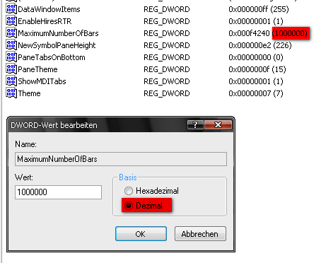 Es gibt ein verstecktes Feature, das für leistungsfähigere PCs erlaubt, die max. Anzahl an Bars in den Datenbank Einstellungen heraufzusetzen. Dazu muss man nur einen DWORD Schlüssel in der Windows Registrierung hinzufügen. Aufgerufen wird letztere über Startmenü>Ausführen>regedit