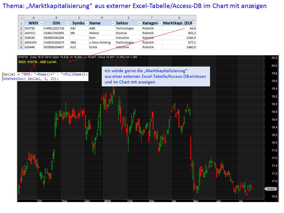 Aber da du nun mal auf externe Dateien Datenbanken zugreifen willst, stünde zum Bsp. das ODBC Plugin zur Verfügung. amibroker.com/odbc.html Dieses Plugin beinhaltet ODBC Data und ODBC AFL. Für deine Zwecke wird nur ODBC AFL benötigt. Bsp. angehängt.