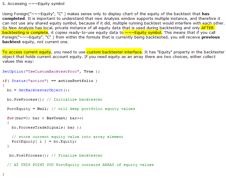 ~~~Equity Symbol ist ein Array, das erst nach einem Backtest gefüllt zur Verfügung steht. Um auf die "bar by bar" Equity zuzugreifen, musst du den sogenannten "Custom backtester" nutzen. Brauchst du für deine Angelegenheit aber nicht.