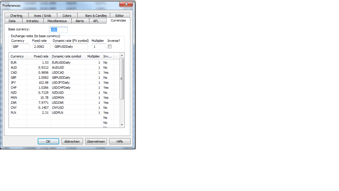 Ich habe unter "Symbol" schon alles richtig eingetragen (Round Lot Size, Margin Deposit, usw.), und auch unter "Tools"->"Preferences" -> "Currencies" passt. m.W. nach alles (siehe Bild).