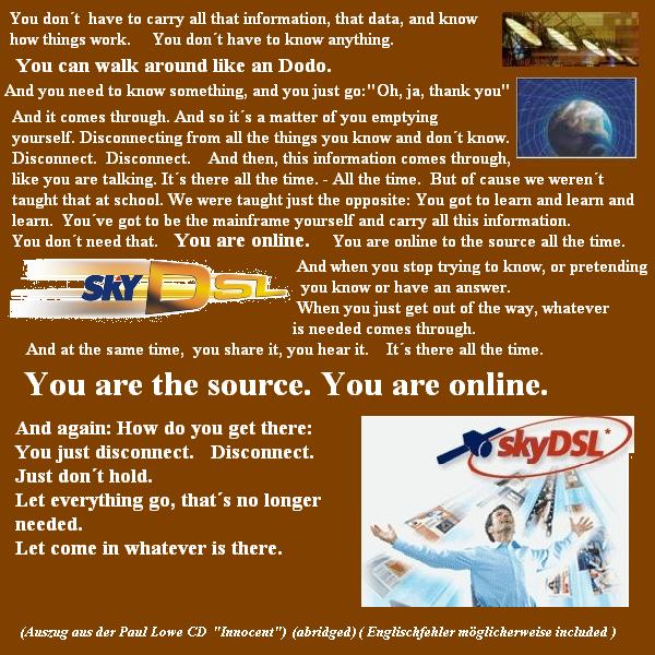 Überhaupt ist dieses Land durch vieles hindurchgegangen und hat sehr exteme Erfahrungen gemacht. Die Fähigkeit , zu erkennen, dass die alten Systeme und Konzepte nicht mehr funktionieren, daß sie nur in Krankheit und Zerstörung von Natur und Erde und damit in Agonie führen, ist durchaus vorhanden. Die gleiche kraftvolle Energie , die sich jetzt auf die alte Art eigentlich nicht mehr benutzen läßt , könnte, wenn sie bewußt eingesetzt würde , einen Wandel für die ganze Welt mitbewirken, eben wenn sie aus dem Potential des Selbst,