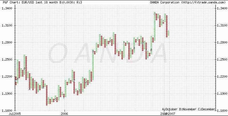 For example, in the P&F chart for EUR/USD, if the Box size is 30 pips (indicated with B:0.0030), and Reversal size is 3 (R:3) and we currently have an uptrend (column of X's), a price increase of more than 30 pips over a period of time will add more X on top of the column while a price decrease of more than 90 pips will reverse the trend and create a column of O's corresponding to the amount of fallen price.