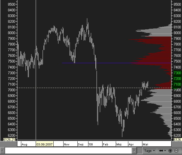 Die Anzeige bezieht sich auf den sichtbaren Chartausschnit aber die aktuelle,noch nicht abgeschlossenen Periode ist ausgeklammert! Allerdings wird sich nach Vollendung der aktuellen Kerze das Histogramm nicht großartig verändern, da die Masse der Volumenticks pro Level-Step (FDAX 0,5 pro 1Tick ) gerechnet wird, und die Anhäufungen auf den Levels bereits massiv ist! Dieses Histogramm hat für den dargestellten Zeitraum etwas länger (ca. 7-14 Tage) Gültigkeit!