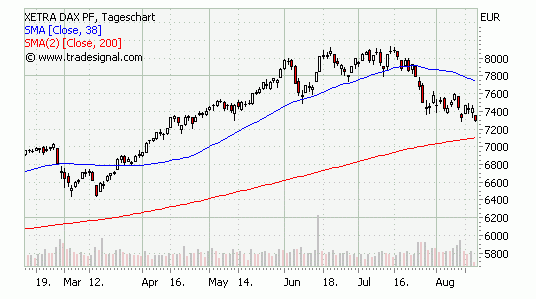 Die Zeitungen sind voll von Warnungen vor fallenden Kursen. Einen besseren Hinweis darauf, dass die Kurse erst mal wieder rauf gehen sollten, gibt es meiner Meinung nach nicht. Daher sollten wir wohl erst mal wieder Richtung 7600 laufen, bevor sich eine weitere Entscheidung anbahnt.