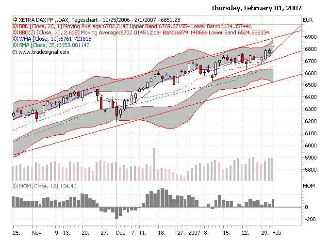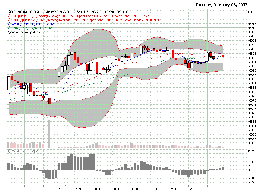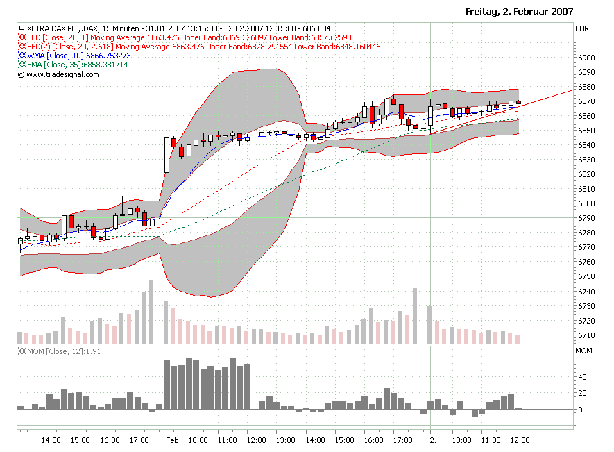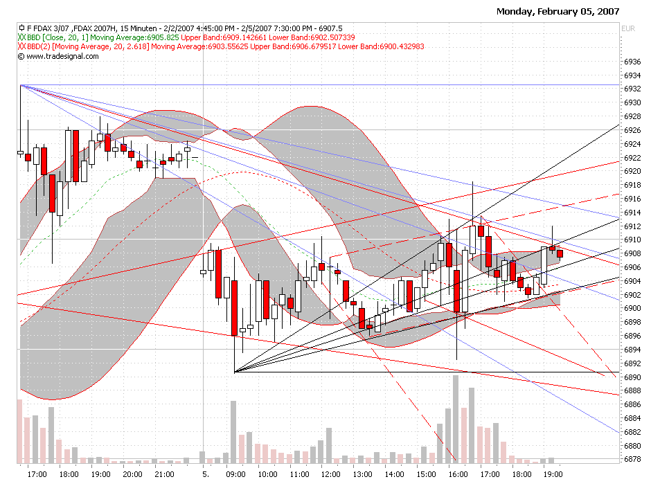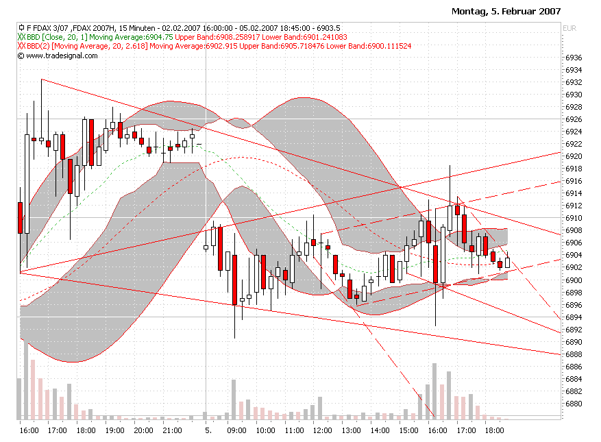 DAX heute, wenn ich mir den 15m Chart ansehe wird mir schlecht, keine Bewegung, bei den BB`s laufen wir in der neutralen Phase sym. wieder in ein Dreieck, wie immer vor den WZ, die heute 14.30/16.00 anstehen. Dann wird sich das Dreieck in welche Richtung auch immer, auflösen. Mal sehen durch welche Tür alle auf einmal wollen. Ich kann mich ja nur hinten anstellen.