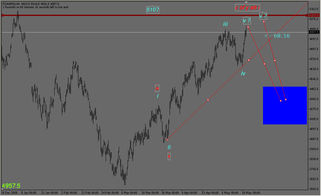 Ein kurzfristiger Downtrend liegt im Moment vor. In den nächsten 2-3 Tagen ist ein Abrutschen mind. bis ca. 4750 durchaus möglich. Das Upmomentan darf jedoch m.E. nicht unterschätzt werden, insofern der grüne Fibofächer nachwievor bestätigt werden sollte und ein Durchbruch nach oben, durch die roten Fibofächer vollzogen werden sollte.