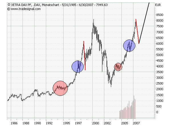 Gestern traute ich mich das nicht zu schreiben, aber ich werde es doch wagen. Wenn man sich den Monat Chart anguckt, müßte der Markt ca. 1800 bis 2000 Punkte herunterkommen, so wie er es 1997 getan hat. Danach ist er dann auf 8132 Punkte geklettert. Davon ausgehend das sich Formationen wiederholen, wird er dies in etwa auch so praktizieren. Ich hänge mal ein Bild an, dort kann man es gut sehen.