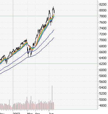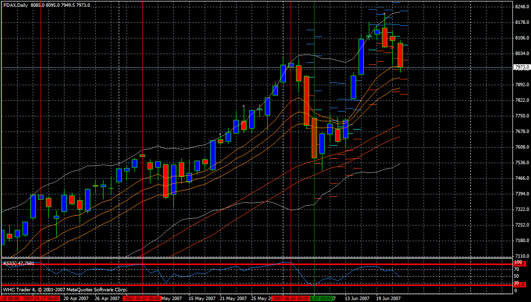 Z.B. reden wir jetzt wieder von Fondspleiten (Bear Stearns). Wenn dies größere Ausmaße annehmen würde, dann sähe sich die Federal Reserve Bank evtl. gezwungen, den onehin aufgedrehten Liquiditätshahn noch größer aufzudrehen, um verschreckte Anleger an der Börse und in ihren Investments zu halten. Dann könnte es in der Folge auch noch eine schöne Aktienhausse geben, die sich durch die global notierten Gesellschaften natürlich auch auf anderen Plätzen fortsetzen würde. So ein Szenario würde dann wahrscheinlich den Fraktal-Set-up zerstören.