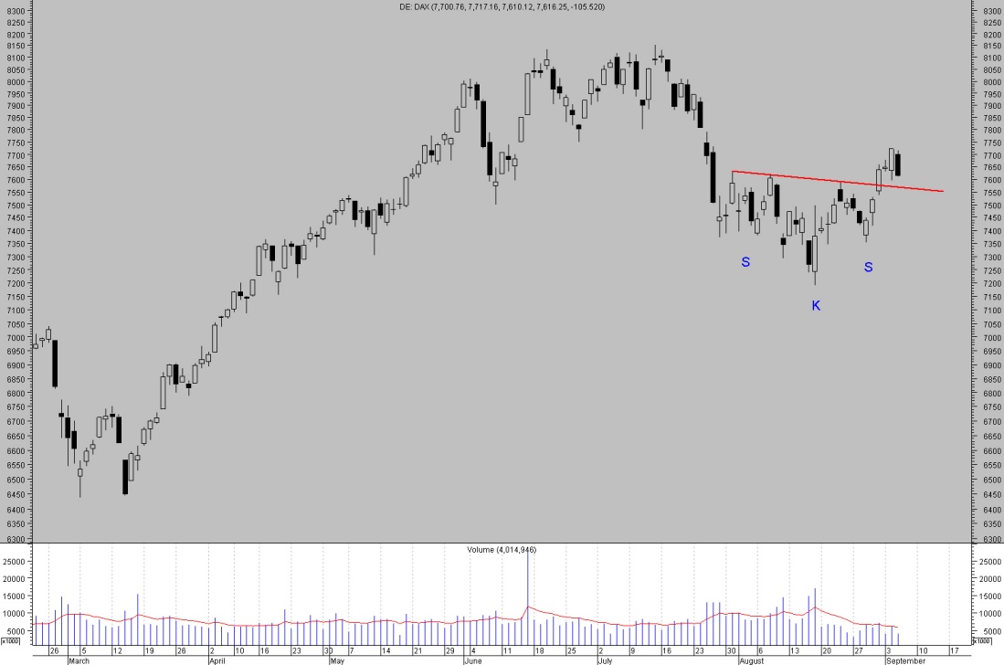 Die bestätigte inverse SKS sieht nun jeder (was nicht unbedingt von Vorteil ist). In den Kommentaren wird immer wieder auf das relativ niedrige Volumen hingewiesen, was viele skeptisch bleiben lässt, ob wir hier nicht einem Fehlsignal aufsitzen. Hinzu kommen die Verweise auf den traditionell schlechten Börsenmonat September und den historisch oft dagewesenen Kursrutsch im September/Oktober eines 7er Jahres. Die Sentimentwerte waren dazu stark auf Pessimismus gedreht. Spricht eigentlich alles für steigende Kurse - nun hat der Chart nen Knicks bekommen. Rücksetzer auf die Ausbruchslinie oder tatsächlich Fehlsignal? Wird spannend in den nächsten Tagen.