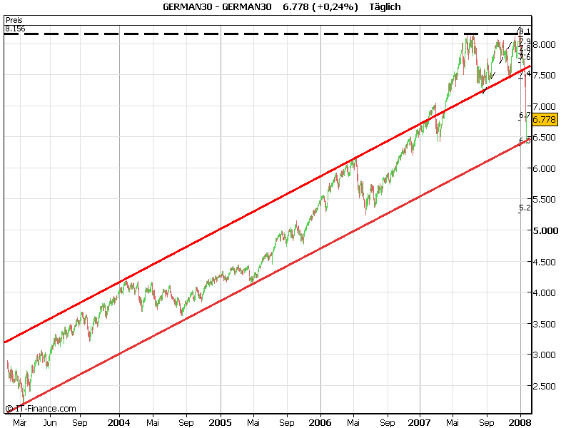 Was mich ja an diesem ganzen Drama so ärgert ist, das mein Tradingkonto im Cash ist, und mein alter VWL-Fonds über den ich am 1.1. hätte verfügen können, jetzt Verluste einfährt, die ich mit meiner Enthaltung von den Märkten versuchte habe zu vermeiden. Nun muss ich das wohl aussitzen. Fundamental ist doch eigentlich alles I.O.. Nix ixt wie 2000, sollte also nicht so lange dauern bis der Trend wieder nach Norden dreht. Ich werde mich noch aus dem Handel raushalten, bin halt noch zu frisch im Geschäft und da ich nur mit CFD handele ist mir der Hebel im Moment zu selbstmörderisch.