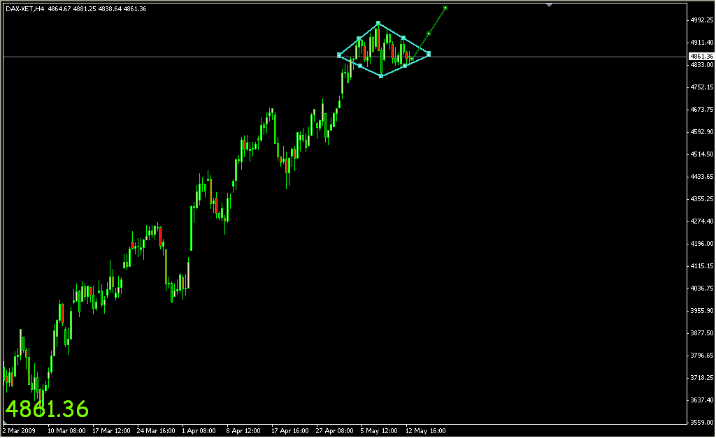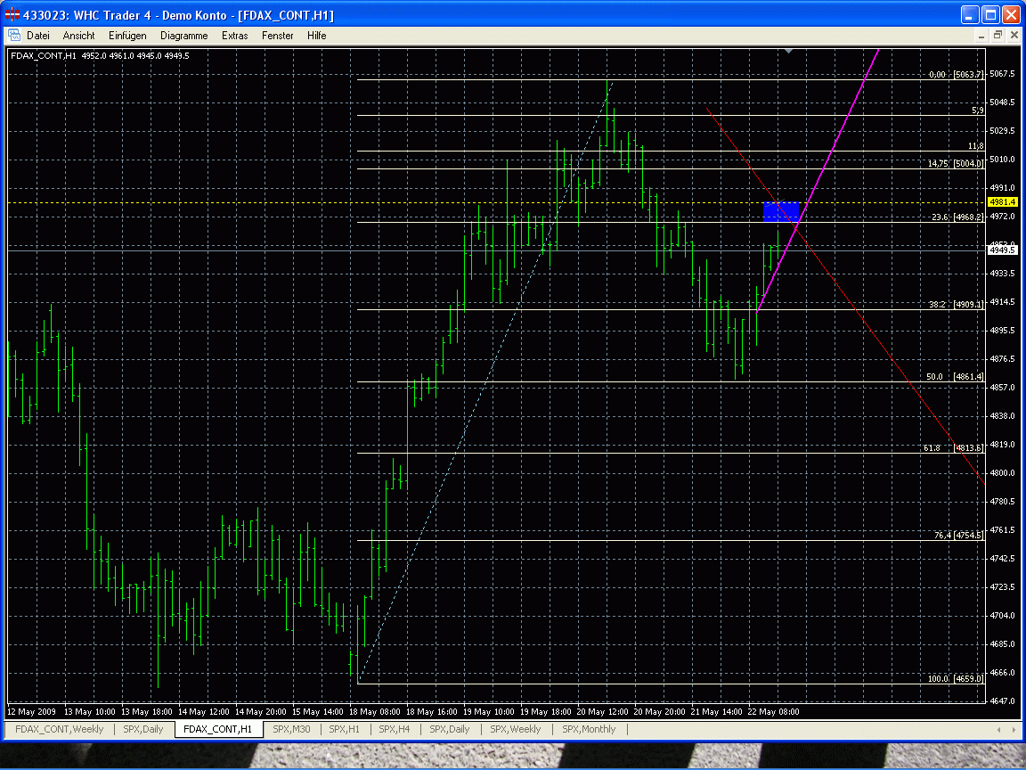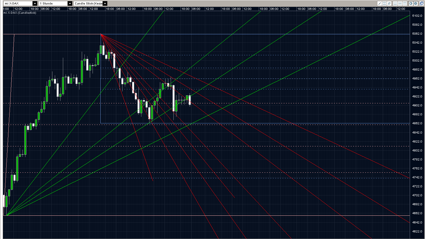Ein kurzfristiger Downtrend liegt im Moment vor. In den nächsten 2-3 Tagen ist ein Abrutschen mind. bis ca. 4750 durchaus möglich. Das Upmomentan darf jedoch m.E. nicht unterschätzt werden, insofern der grüne Fibofächer nachwievor bestätigt werden sollte und ein Durchbruch nach oben, durch die roten Fibofächer vollzogen werden sollte.