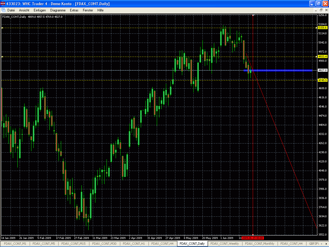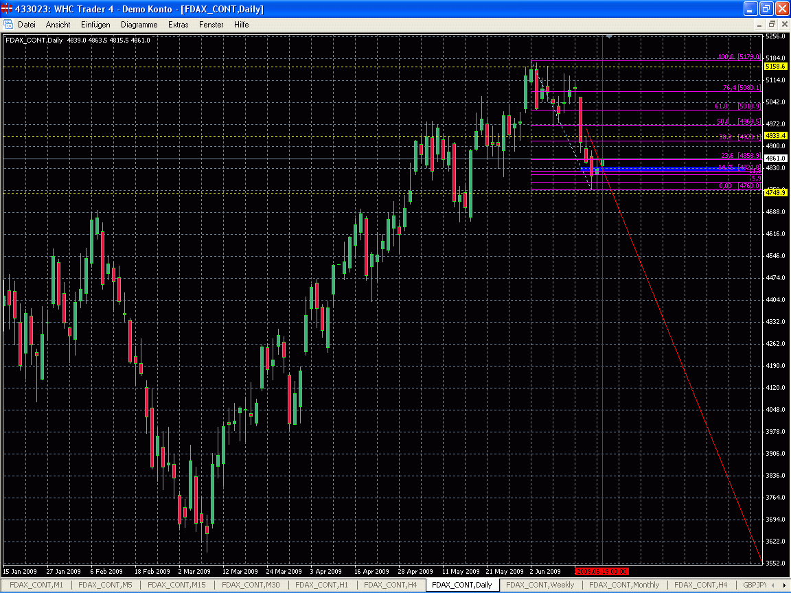 Wenn es mal nicht so genau klappt, dann kann man die Fibos auch manuell genau ausrichten. Doppelklick auf der Fibo Verbindungslinie, dann auf dieser Linie einen Rechtsklick machen und im Kontextmenü 'Fiboeigenschaften' aufrufen. Den Reiter 'Parameter' anklicken und die Werte für Tief- und Hochpunkt manuell ändern.
