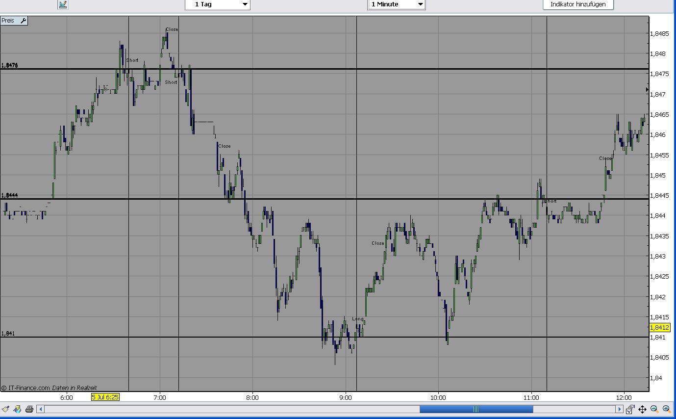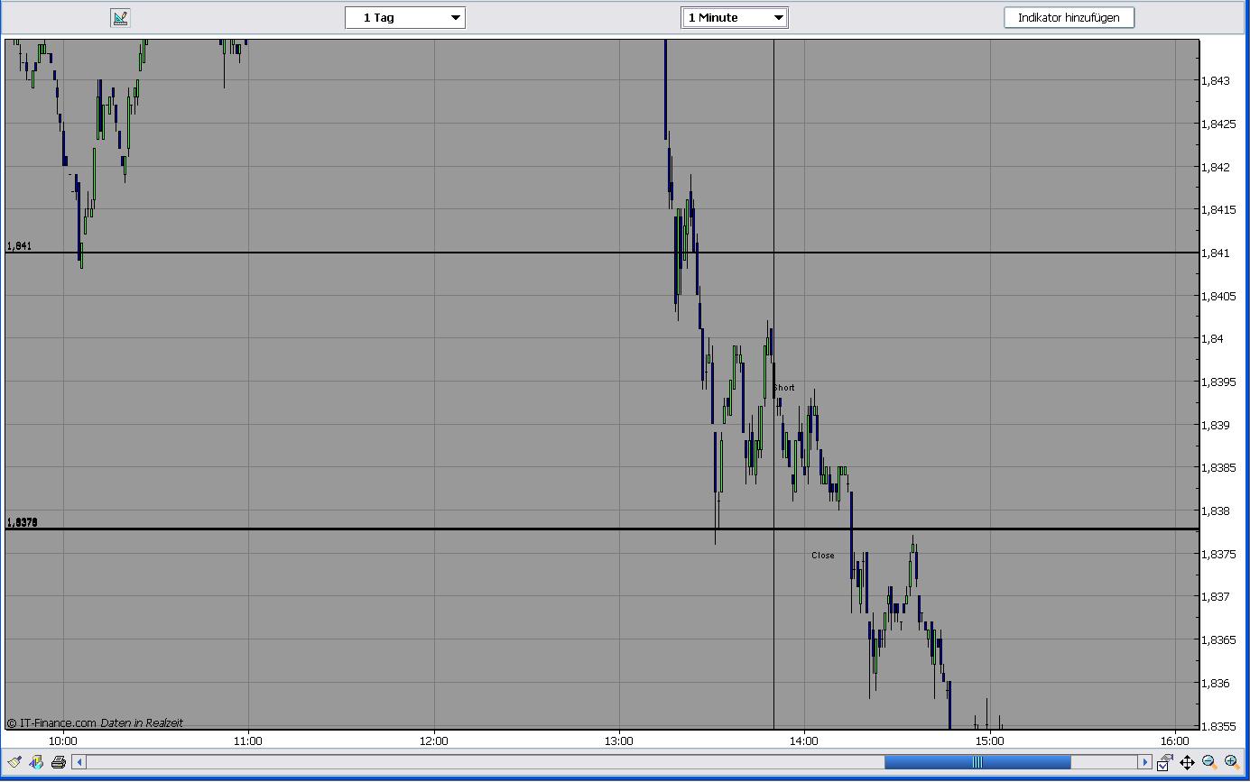 2 Trade: Der Bereich um den R1 stellte sich als ein unüberwindbarer Widerstand heraus. Daher wieder short @ 1,8476 um 8.10 Uhr. Mein Ziel war weiterhin 1,8460. Dieses wurde auch erreicht. --> + 16 Pips