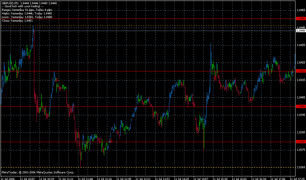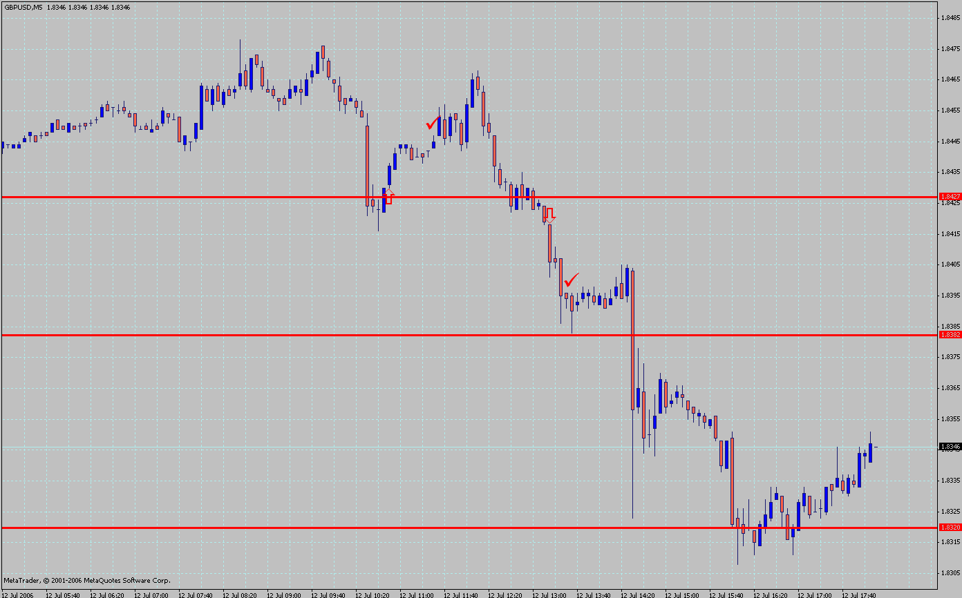 2 Trade: Sowohl der EUR/USD als auch der USD/JPY zeigte eine deutliche Dollarstärke. Daraufhin setzte ich beim Cable ebenfalls auf einen steigenden Dollar als das Tagestief gebrochen wurde. Short @ 1,8415 um 13.11 Uhr. Das Ziel war wieder der SP bei 1,8400. Wurde ebenfalls erreicht --> +15 Pips