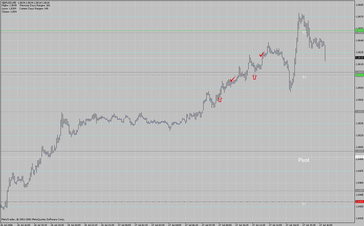 1 Trade: Dieser Trade war als Big Ben gedacht. Als das letzte lokale Hoch überwunden wurde ging ich long @ 1,8578 um 9.05 Uhr. Mein Ziel war R1. Jedoch verlief der Ausbruch nicht gerade mustergültig. Der Impuls des Ausbruches verlief weitgehend in einer Seitwärtsbewegung. Da der Grund für den Einstieg (Impuls nach Ausbruch) nicht mehr zutraf, schloss ich die Position mit ein paar Pips. --> +9 Pips