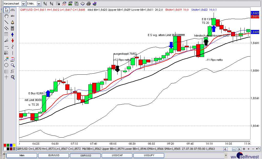 War nicht gewollt, aber da im 1. Trade ausgestoppt, war das alte Limit bei 96 noch in der Ordereingabe, somit short um 10.25 h mit 1,8596. Wurde nach Rückkehr um 11.10 h sofort mit 1,8607 geschlossen ---> -11 Pips