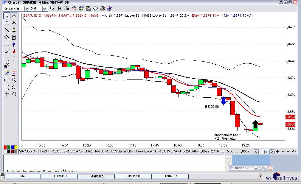 Nachdem SP wieder erreicht und 00 zu 20 und zurück gelaufen sowie Bruch des R1 um 20.00 Uhr short mit 92/96, SL zunächst 12, dann laufend nachgezogen. Ausgestoppt um 20.35 h mit 64/68. ---> +24 Pips